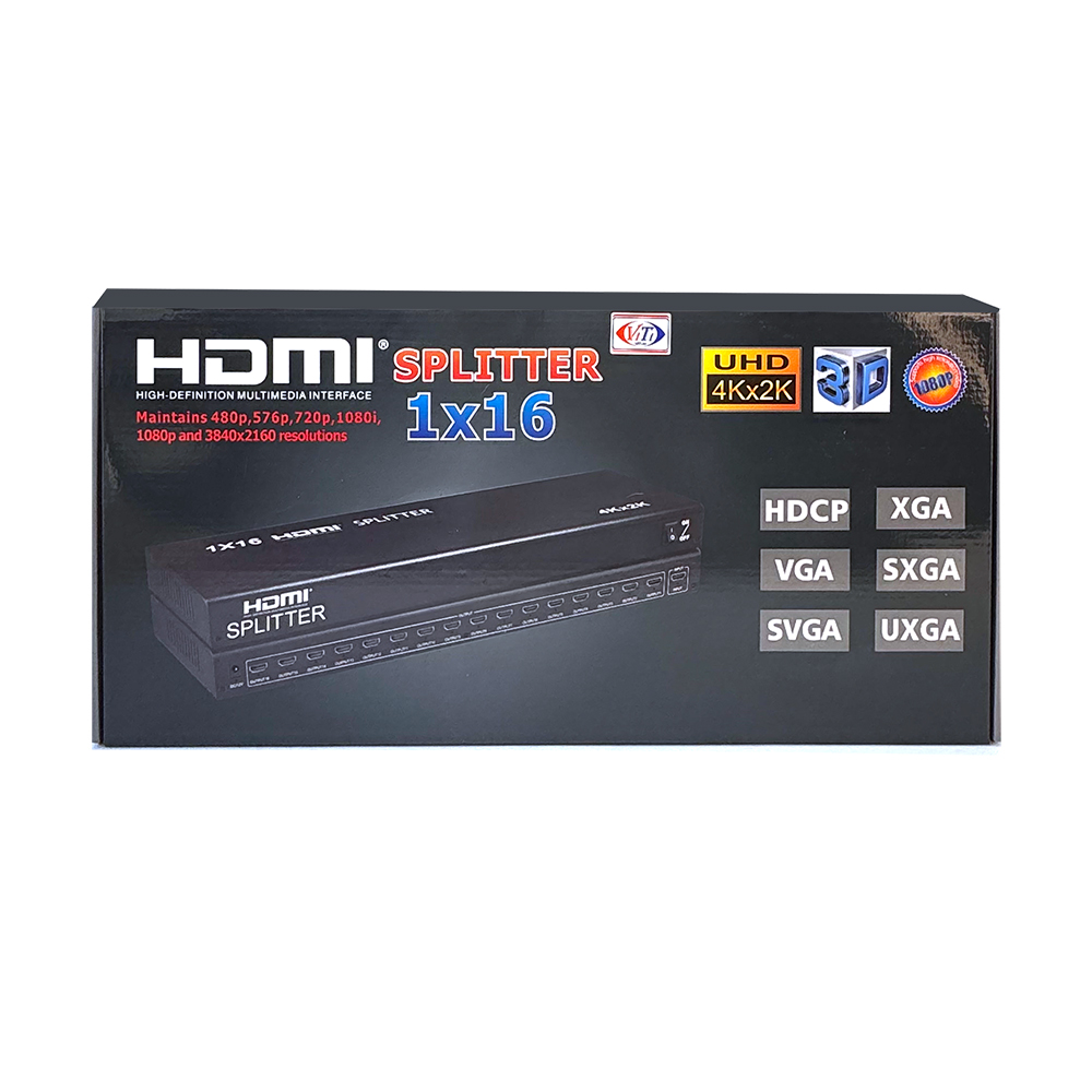 Сплиттер 1x16 (он же разветвитель 1x16, или делитель 1x16) цифрового аудио/видео HDMI-сигнала: 1 HDMI-вход, 16 HDMI-выходов. Сигнал от одного HDMI-источника (ТВ-ресивер, медиаплеер, DVD/BD-плеер, игровая приставка, мультимедийный компьютер и т. д.) может направляться одновременно к нескольким (до 16) HDTV-дисплеям (телевизорам, панелям, проекторам и т. п.).