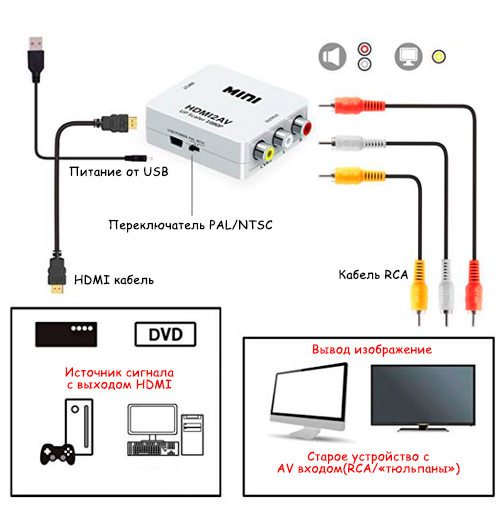 Это маленькое компактное устройство преобразует сигнал с HDMI (с компьютера, ноутбука, видеокамеры, фотоаппарата, игровой приставки и др.) в сигнал RCA со звуком ("тюльпаны": красный желтый и белый - телевизор, Проектор, жк-панель и др.).