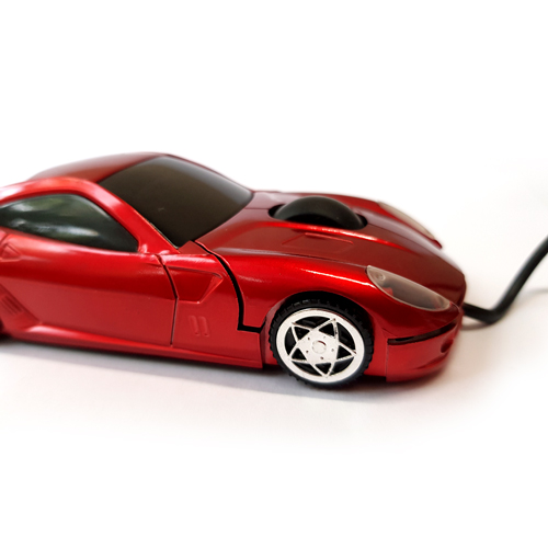 Оптическая компьютерная мышь, выполненная в виде автомобиля красного цвета, имеет эргономичный дизайн и оснащена двумя кнопками, расположенными на капоте, и колесом прокрутки. Во время работы у мышки горят фары.